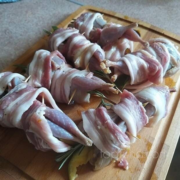В пузо каждой птахе вложить по паре веток розмарина и куску манго, обернуть беконом, закрепить зубочисткой