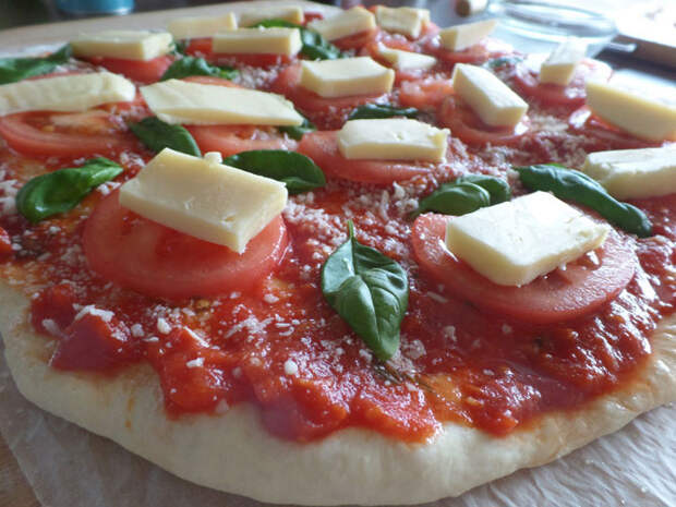 Смазываем раскатанное тесто остывшим соусом, посыпаем пармезаном, выкладываем кружки помидоров. На томаты выкладываем кусочки сыра. Свежий базилик сейчас добавлять не нужно – он почернеет в духовке. На фото он у меня для красоты. Оставшийся соус можно перелить в стеклянную банку. Он не испортится в холодильнике дня 3-4, и прекрасно сочетается с макаронами. Можно его заморозить до следующего раза, когда вы захотите испечь пиццу, не обязательно «Маргариту».