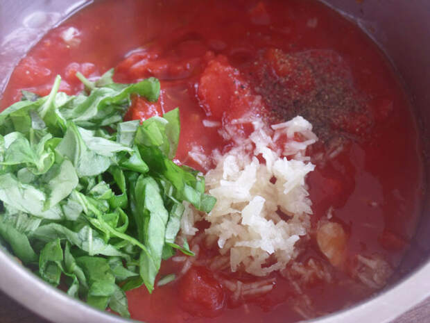 Приготовим соус. Банку с помидорами выливаем в сотейник. Если они со шкурками, то удалим их. Добавим тертый чеснок. С десяток самых красивых листьев базилика отложим, остальные мелко порежем и тоже добавим в сотейник, плюс оливковое масло, соль и перец.