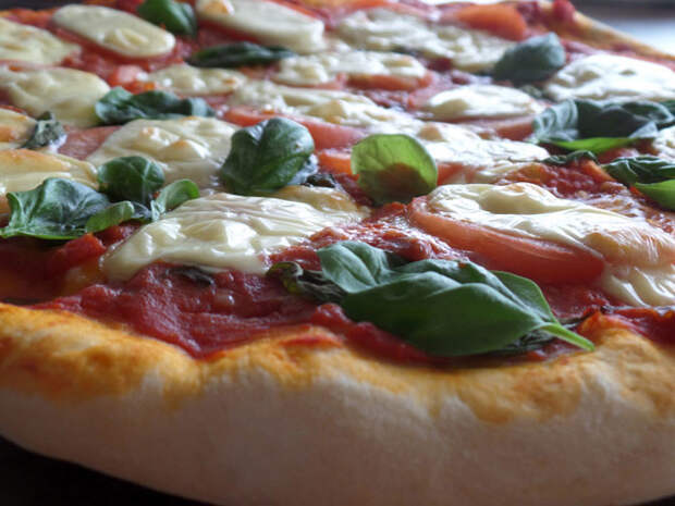 Как только сыр на помидорах расплавится, а это происходит минут через 10-15, «Маргарита» готова! Вынимаем пиццу, раскладываем листики базилика между помидорами и подаём. Такая пицца стоит того, чтобы возиться с тестом, выращивать базилик и варить томатный соус самостоятельно.
